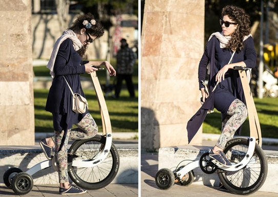 Halfbike II采用了前置大輪加上兩個(gè)小型后輪的設(shè)計(jì),同時(shí)包含一個(gè)水平把手。通過(guò)鏈條驅(qū)動(dòng)前輪運(yùn)轉(zhuǎn)。兩個(gè)小型后輪用來(lái)控制轉(zhuǎn)向以及整輛車的剎車。其整個(gè)車身車架采用鋁合金和復(fù)合板材制作,重量?jī)H為8.2公斤。另外Halfbike II采用了折疊的方式,無(wú)論是公交車還是地鐵,都可以方便攜帶。折疊起來(lái)甚至還可以裝進(jìn)汽車后備箱和辦公桌下面。
