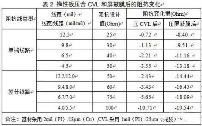 從不同流程后的線路阻抗對(duì)比上可以看出,在蝕刻后的線路上依次壓合CVL、電磁屏蔽膜后其阻抗值均呈現(xiàn)下降,如表2所示。