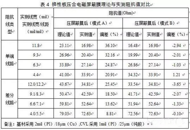 對(duì)于撓性板壓合電磁屏蔽膜后的理論阻抗計(jì)算,目前存在著兩種方式:一是將電磁屏蔽膜當(dāng)成一層介質(zhì)層,即采用圖1中模式A進(jìn)行計(jì)算,這種模式將雙面撓性板的線路視為外層微帶線的結(jié)構(gòu);二是將電磁屏蔽膜的導(dǎo)電層當(dāng)作成一層銅皮,即采用圖1中模式B進(jìn)行計(jì)算,這種模式將雙面撓性板的線路視為內(nèi)層帶狀線的結(jié)構(gòu)。將供應(yīng)商所提供的電磁屏蔽膜介電常數(shù)68.3、純膠層介電常數(shù)為2.0和PI層介電常數(shù)為2.7,分別采用圖1中的模式A和模式B并根據(jù)實(shí)測(cè)的線寬線距進(jìn)行理論阻抗計(jì)算,結(jié)果如表4所示。