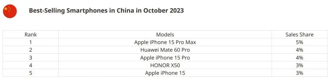 2023 年 10 月,中國(guó)最暢銷的智能手機(jī)并非來(lái)自華為 Mate 60 系列,而是蘋果的 iPhone 15 Pro Max,其市場(chǎng)份額高達(dá) 5%。