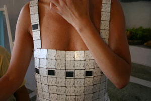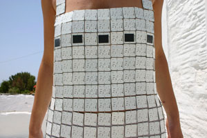 今天看到的這款衣服有些特別,所用的材料并不是采用纖維或者織物,而是采用白色的電路板組成,一共436塊,每塊電路由金屬環(huán)連接。電路板上集成了太陽能電池,白天在光照下可以存儲能量轉(zhuǎn)化為電能,在黑夜或者幽暗的環(huán)境下,衣服便會發(fā)出光。