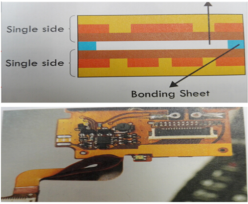 當(dāng)單面軟板無法負(fù)擔(dān)連接密度時(shí)就必須增加導(dǎo)電層,高分子厚膜技術(shù)也可以用在此類產(chǎn)品,只是印刷必須分面制作。雙面線路設(shè)計(jì)會(huì)充分利用各單面繞線面積,靠選擇性互連滿足更復(fù)雜的連接需求。許多不同的雙面間連接,都可以連成面間連通。典型雙面軟板結(jié)構(gòu)如圖所示: