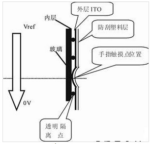 電容式觸摸屏是在玻璃表面貼上一層透明的特殊金屬導(dǎo)電物質(zhì)。當(dāng)手指觸摸在金屬層上時,觸點(diǎn)的電容就會發(fā)生變化,使得與之相連的振蕩器頻率發(fā)生變化,通過測量頻率變化可以確定觸摸位置獲得信息。