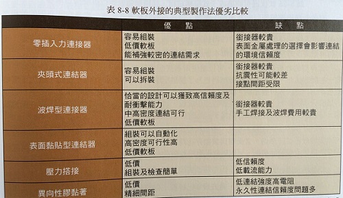 即使軟板的設(shè)計(jì)可以省掉一些連接器,但有一些連接器的設(shè)計(jì)是無法避免的,那就是一些軟板對(duì)外連接的設(shè)計(jì),深圳FPC廠常用的設(shè)計(jì)模式及一般性的優(yōu)劣特性比較,如表8-8所示。某些基本的連接器相對(duì)簡(jiǎn)單,典型的包括:絕緣交替式與夾持型連接器,這些都普遍應(yīng)用在低成本應(yīng)用,它們一般并不被認(rèn)定有高信賴度。
