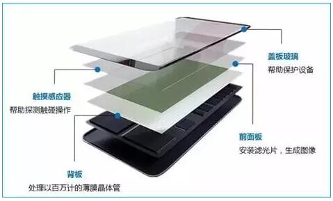 最下面一層為背板,用來(lái)處理百萬(wàn)計(jì)的薄膜晶體管。