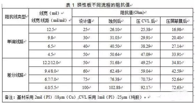 壓合電磁屏蔽膜的撓性板一般為雙面板,頂層分布信號傳輸線路,底層為接地層。實驗采用了雙面撓性板結(jié)構(gòu),以蝕刻后的線路阻抗為基準(zhǔn),分別設(shè)計了單端線路25~50 Ohm和差分線路50~100 Ohm,依次在線路蝕刻后、壓合CVL后、壓屏蔽膜后測試線路的阻抗值,結(jié)果如表1所示。