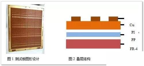 設(shè)計(jì)4層剛撓結(jié)合板,L1/L2為撓性層,L3/L4為剛性層。結(jié)合實(shí)際生產(chǎn)板,參照相關(guān)設(shè)計(jì)標(biāo)準(zhǔn),在L1層上設(shè)計(jì)了一系列不同規(guī)格的焊盤,測(cè)試板圖形設(shè)計(jì)及疊層結(jié)構(gòu)分別如圖2及圖3所示。