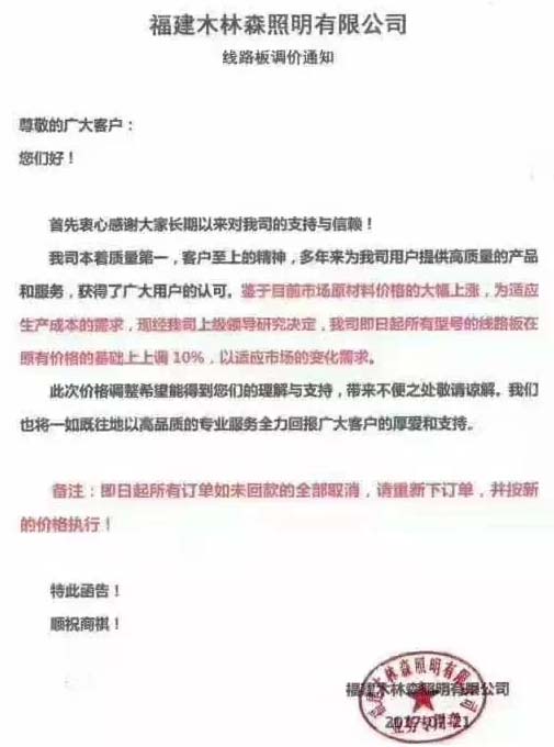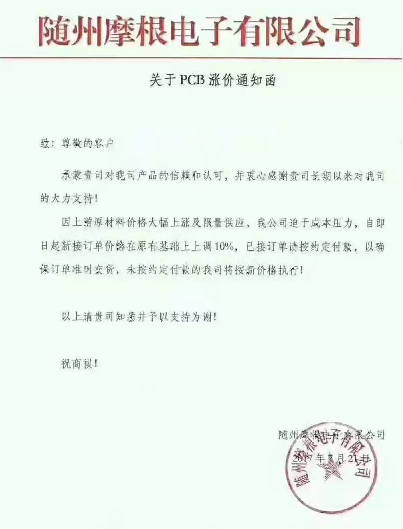7月5日-11日,柔性線路板就有報(bào)道過(guò)山東金寶、建滔、明康、威利邦、金安國(guó)紀(jì)等數(shù)家公司先后發(fā)布銅箔、覆銅板等漲價(jià)通知,漲價(jià)行情為銅箔每噸上調(diào)1000-2000元,紙板上調(diào)10元/張,絕緣玻纖ccl上調(diào)5元/張,板料上調(diào)5元/張?,F(xiàn)在就看到有柔性線路板行業(yè)也發(fā)出漲價(jià)通知了。