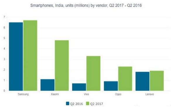 vivo能排在第三位主要是借助它們在印度二三線城市的良好戰(zhàn)績。第二季,vivo出貨量達創(chuàng)紀錄的340萬臺。OPPO和聯(lián)想則緊隨vivo之后,排在第五名的聯(lián)想本季出貨量為190萬臺。