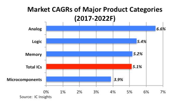 IC Insights預(yù)測未來五年整體集成電路市場的年復(fù)合增長率在5.1%左右。2017年全球集成電路市場增速達(dá)到22%,IC Insights預(yù)計2018年全球集成電路增速將達(dá)到8%,規(guī)模達(dá)到3939億美元,2022年全球集成電路市場規(guī)模將達(dá)到4668億美元。