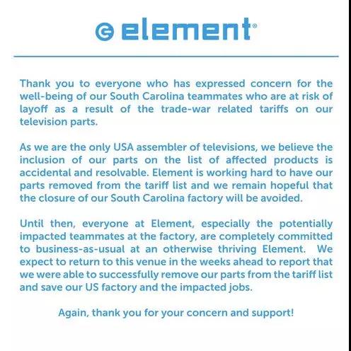 Element表示,裁員和工廠關閉是美國對從中國進口商品征收關稅的直接結果,商品中包括Element用于組合電視的重要部分。