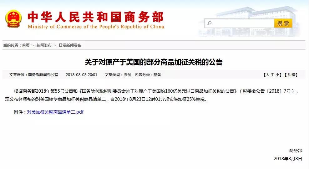 中國商務部稱,將從8月23日12時01分起,對333項約160億美元進口的美國商品加征25%關稅,涉及多項能源、化工、汽車、賤金屬、鋼鐵產(chǎn)品、醫(yī)療器械設備等產(chǎn)品。這與此前美國決定的8月23日向160億美元中國商品加征25%關稅的時間點一樣。