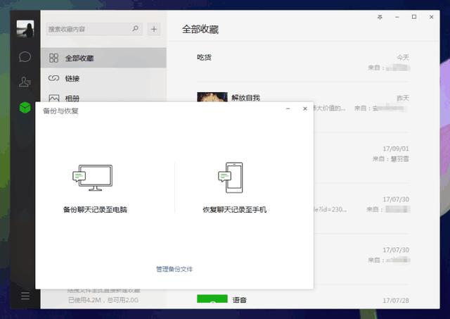 將微信聊天記錄導入到電腦也是一種方法,不用連接的,在電腦上登錄微信,左下角“備份與恢復”,然后按照步驟 “備份聊天記錄到電腦”或“恢復聊天記錄到手機”即可。(點擊管理備份,可以查看微信聊天記錄備份路徑)