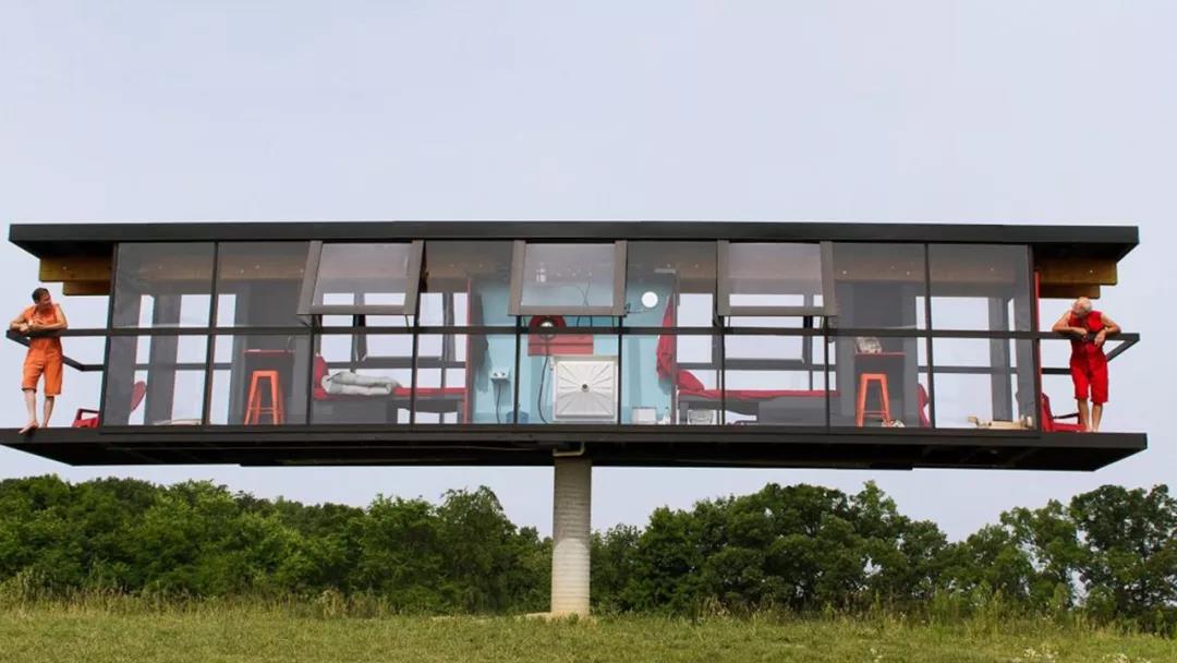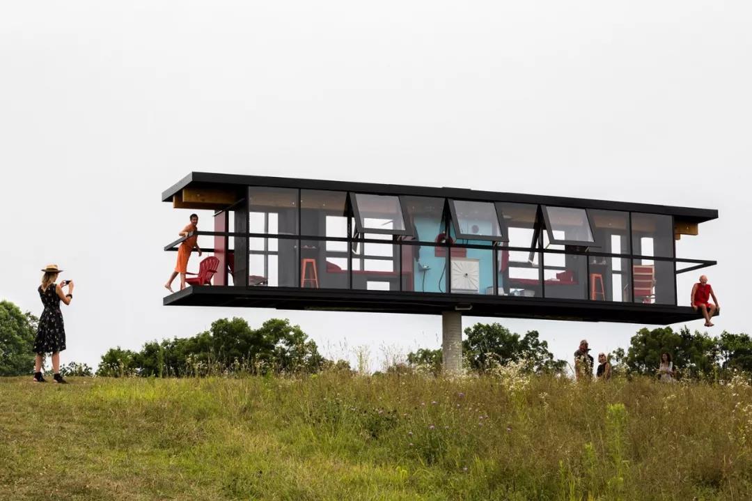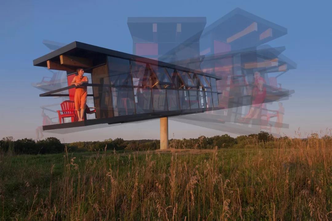 美國(guó)紐約北部的室外雕塑公園里,有一座可居住的雕塑ReActor,是由藝術(shù)家亞歷山大和沃德共同完成的作品,長(zhǎng)約13米,寬約2.5米,下方的混凝土柱高4.5米,這座雕塑看起來(lái)就像是一間蹺蹺屋,不僅能隨外部和內(nèi)部的變化傾斜,還能旋轉(zhuǎn)360度。