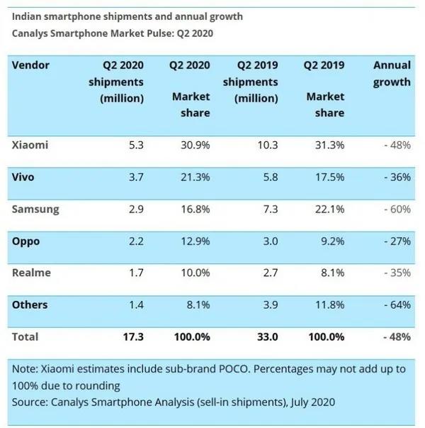 在疫情封鎖期間,印度國內(nèi)的智能手機(jī)被歸類為非必需品,甚至連亞馬遜和Flipkart等巨頭都禁止在印度分銷手機(jī)產(chǎn)品,這種僵局一直持續(xù)到5月中旬。Canalys報(bào)告數(shù)據(jù)顯示,今年第二季度,印度整體的智能手機(jī)出貨量只有1730萬臺,這比2019年第二季度的3300萬臺同比下降了48%。