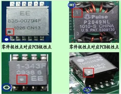 PCB板極性:圓圈/圓點/字母“1或A”/斜角標(biāo)示。