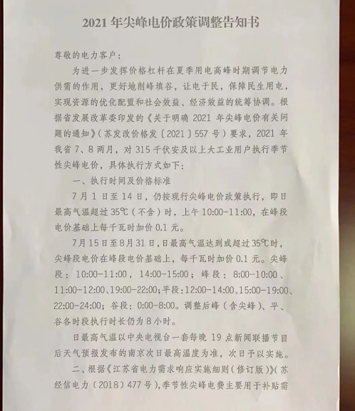 國網(wǎng)江蘇電力公司針對當?shù)赜秒姶髴粼?月-8月實施季節(jié)性尖峰電價,這將導致該地區(qū)工業(yè)用電價格比峰期電價高出0.1元/千瓦時。
