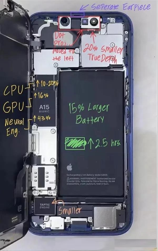 從熱心“課代表”的總結(jié)來看,蘋果重構(gòu)了Face ID模塊,點陣投影器被挪至左側(cè)、微縫聽筒獨立放置在上方、前置攝像頭移到TrueDepth攝像頭系統(tǒng)的左側(cè),紅外鏡頭+泛光感應(yīng)元件的體積比之前明顯縮小。這些動作進一步實現(xiàn)了更小的劉海,蘋果在多年保持相同尺寸的情況下,將iPhone 13的劉??s小了20%。