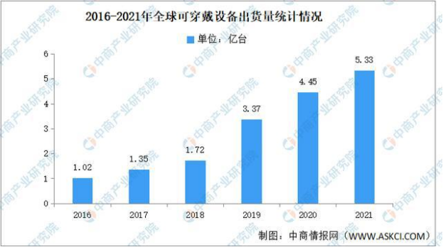 近年來(lái),在市場(chǎng)需求和技術(shù)支持的背景下,全球可穿戴設(shè)備出貨量不斷增長(zhǎng)。據(jù)FPC小編了解,全球可穿戴設(shè)備出貨量從2016年的1.02億臺(tái)增長(zhǎng)至2021年的5.33億臺(tái),年均復(fù)合增長(zhǎng)率達(dá)39.2%。2021年全年,可穿戴設(shè)備出貨5.33億臺(tái),同比增長(zhǎng)20%。