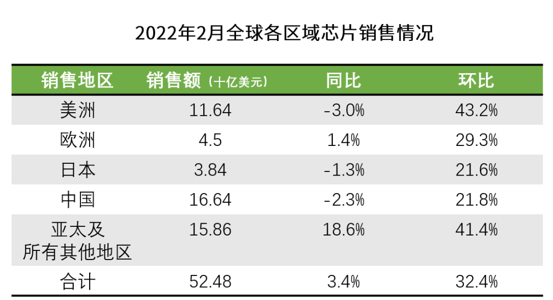 分區(qū)域看,中國仍以166.4億美元的銷售額排名第一,是最大的芯片市場;美洲市場的銷售額為116.4億的美元,歐洲為45億美元,日本為38.4億美元,亞太及所有其他地區(qū)的銷售額為158.6億美元,全球2月芯片市場銷售額總額為524.8億美元。