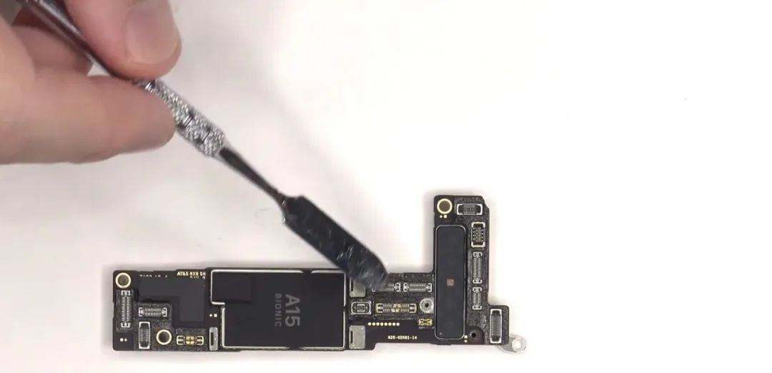 △ iPhone 14 馬達規(guī)格主板為三層夾砂主板,在主板的這一邊有一個五毫米波天線,周邊有石墨填充,以幫助傳遞熱量。連接器周圍有橡膠墊圈。