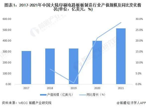 2017-2021年,中國PCB產(chǎn)值規(guī)模整體呈現(xiàn)逐步上漲的態(tài)勢(shì),增速波動(dòng)較為明顯。2021年,由于需求復(fù)蘇、技術(shù)要求升級(jí)以及原材料價(jià)格大幅度上漲等因素影響,中國PCB產(chǎn)值強(qiáng)勁增長(zhǎng),產(chǎn)值規(guī)模達(dá)到511.66億美元,同比增長(zhǎng)28.4%。