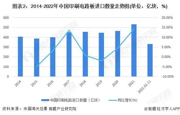 2014-2021年,中國印刷電路板進(jìn)口規(guī)模整體呈現(xiàn)小幅上漲趨勢(shì),2021年進(jìn)口規(guī)模達(dá)到531億塊,同比增長(zhǎng)14.19%。2022年前11個(gè)月,中國印刷電路板進(jìn)口規(guī)模為330億塊,預(yù)期全年進(jìn)口規(guī)模將大幅下滑。