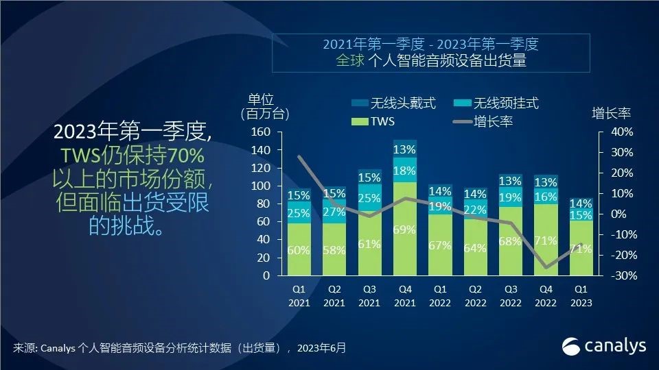 fpc廠了解到,在過去的幾年里,個(gè)人音頻設(shè)備市場一直在倍速式增長,其中TWS更是獨(dú)樹一幟。2022年底和2023年初,TWS連續(xù)兩季度在個(gè)人智能音頻設(shè)備市場占比超過70%。