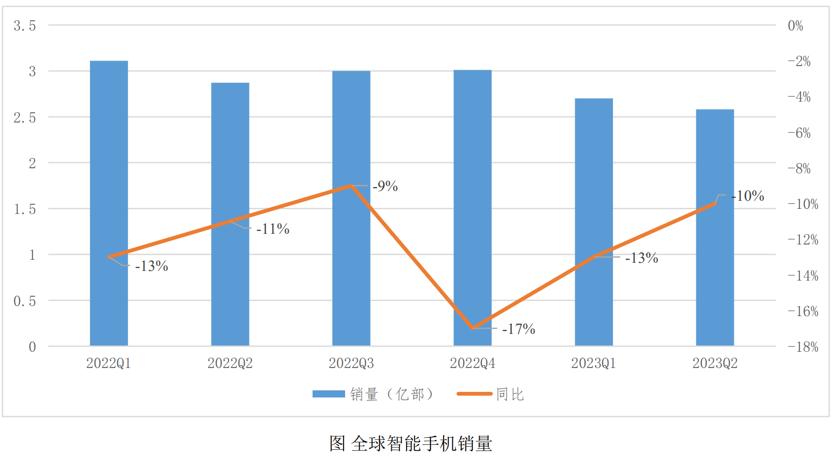 根據(jù)CANALYS的統(tǒng)計(jì)數(shù)據(jù)顯示:2023年第一季度全球智能手機(jī)銷量2.70億部,同比下降13%,第二季度銷量2.58億部,同比下降10%,上半年總體銷量5.28億部,同比下降12%。