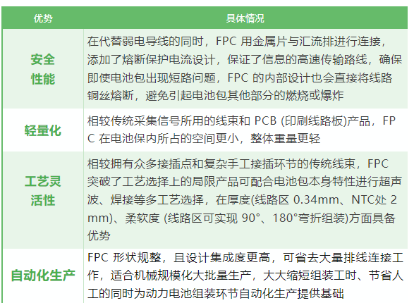 FPC在動力電池模組中應有中有以下優(yōu)勢: