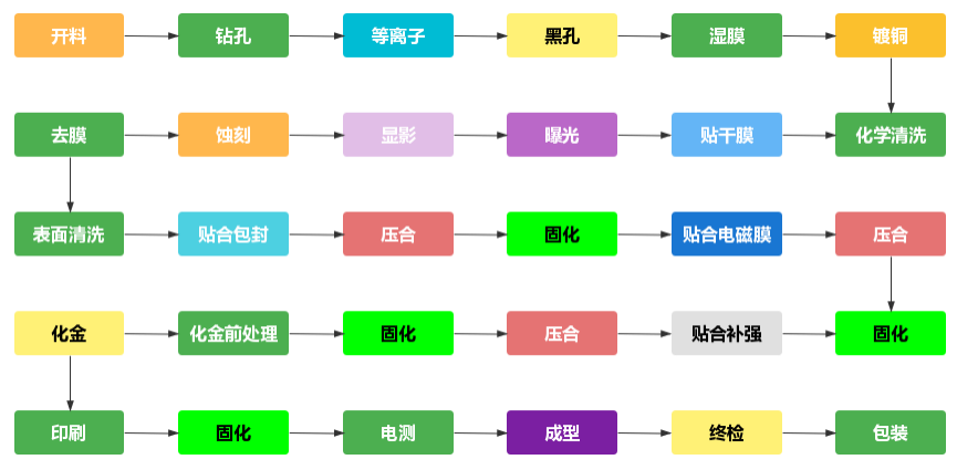 FPC 的生產(chǎn)過(guò)程雖復(fù)雜,但也有其固定模式。主要流程如下: