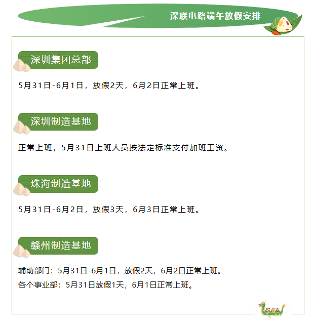 端午假期來(lái)啦!深聯(lián)電路的放假安排請(qǐng)查收~